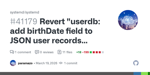 arrow-up11arrow-down1external-linkSystemd reverted userdb and birthdateplus-squaregithub.comcm0002@literature.cafe · 1 day agomessage-square0linkfedilink