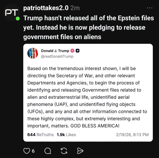FoxtrotDeltaTango@sh.itjust.works · 22 hours agoThis MF is quadrupling down and dropping Alien files before dropping the full, unredacted Epstein Files. GODDAMN.plus-squarelemmy.worldimagemessage-square5linkfedilinkarrow-up126arrow-down12
