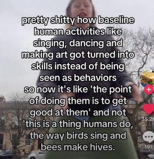 I kinda agree, you are “allowed” to sing or dance or paint just because you want to and not to get good at it, nobody is going to yell at you for that.