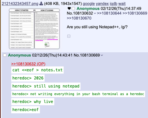 arrow-up15arrow-down1imagewhat kind of a n00b uses a text editor to edit textlemmy.worldkali_fornication@lemmy.world to linuxmemes@lemmy.world · 20 days agomessage-square7linkfedilink