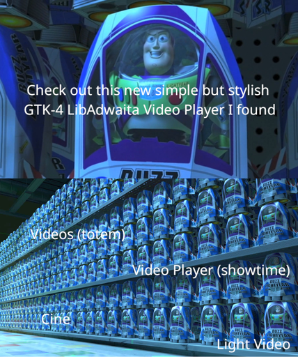 VegOwOtenks@lemmy.world to linuxmemes@lemmy.worldEnglish · 25 days agoYet Another Video Player With Less Controlslemmy.worldimagemessage-square11linkfedilinkarrow-up15arrow-down10file-text