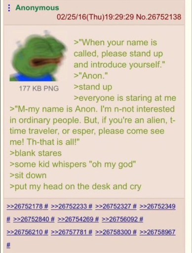 arrow-up1383arrow-down1imageAnon introduces himselfsh.itjust.works🍹Early to RISA 🧉@sh.itjust.worksM to Greentext@sh.itjust.works · 5 days agomessage-square87linkfedilink