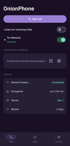 Onionphone is a native Android application for anonymous, end-to-end encrypted push-to-talk voice and text communication over the Tor network. No servers, no accounts, no phone numbers — your .onion address is your identity.