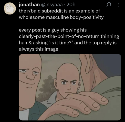 My dad used to ask me to scratch his bald spot when I was like gradeschool age. 25+ years later, he’s still just that small spot in the back. My mom cuts his hair now, keeps it fairly short but I don’t think it’s even that noticeable now that it’s all gray