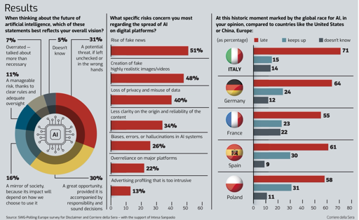 The observatory was created a few months ago, with the contribution of Intesa Sanpaolo bank, as part of the project of Corriere della Sera and Cineca, to deepen the impacts of artificial intelligence through research conducted by SWG. The first report was on journalism. This second report, made by interviewing a sample of citizens from twenty-seven EU countries, is entitled " Our Digital Sovereignty", an issue that has become increasingly urgent every day since the start of Donald Trump’s second term, given all the tensions that are currently unfolding. The fundamental problem is that the European Union over time has accumulated a considerable technological lag, in the meantime carving out a role as regulator of the digital revolution. How important is this delay? And does the restart imply a waiver of the rules? Around these two questions revolves the whole research.
