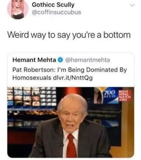 transcription: pat robertson: “im being dominated by homosexuals”. weird way to say your a bottom.