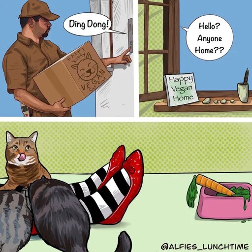 I dislike this, not because it is anti-vegan, but because it is not very well-made as a comic. No punchline. No word play. No visual exaggeration gag. It’s too long to be a visual one-liner, and too short to establish and then break an expectation.