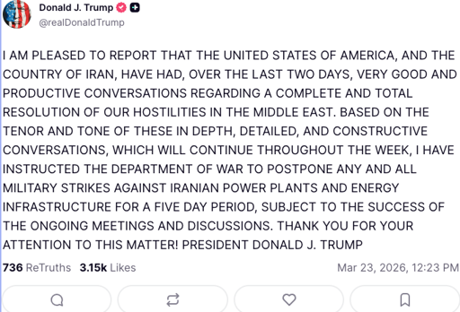 Friday’s press gaggle. Barely exaggerated: at 12:03 PM, President Trump told reporters he wanted a ceasefire with Iran. At 12:05 he declared victory. At 12:07 he announced he was sending Marines. At 12:08 he said no boots on the ground. At 12:11 he said he did not want a ceasefire. At 12:16 he declared victory again. At 12:17 he asked for a ceasefire. At 12:23 he told NATO they were cowards. At 12:29 he said Iran was begging for a ceasefire. At 12:31 he said everything was perfect. At 12:36 he said $500 oil was a good thing. At 12:37 he demanded Iran open Hormuz. At 12:39 he said Hormuz was never closed. At 12:41 he said the US was not at war with Iran. At 12:42 he declared victory in Iran.