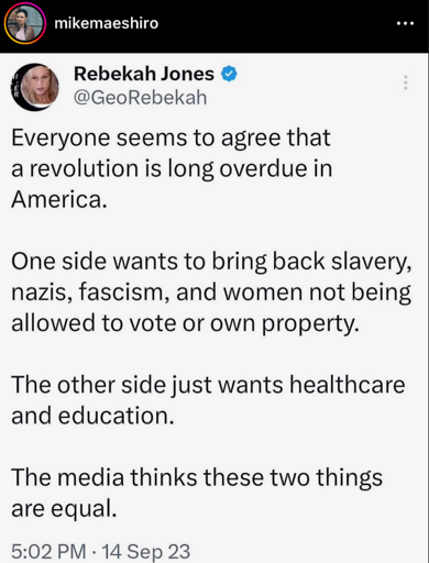 You see it anytime you hear people talking about division or hyper partisanship “on the rise” in that clinical, abstract way that sounds objective. It’s always in a discussion about the current state of “discourse”, and it’s nearly always remarked on like the story is the spike in “disagreements”, and not about what the disagreements are actually about.This pervasive idea that somehow people being upset about the current state of affairs and the rise of actual fascism is some kind of aberration.