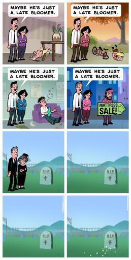 That’s actually why the dad believes the baby is a late bloomer; It took him this long to get a concussion? He’s practically a toddler now!