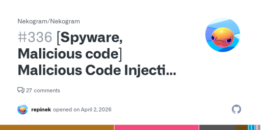 artyom@piefed.social to Opensource@programming.devEnglish · 20 days agoSpyware distributed using modified code in Nekogram release. Dev closes issue without response.github.comexternal-linkmessage-square11linkfedilinkarrow-up166arrow-down10file-text
