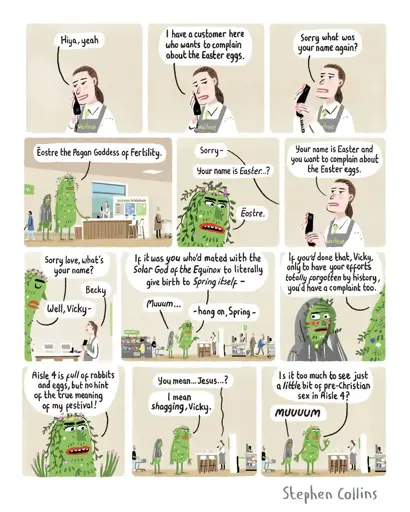 4 [Pull back to show the customer is a very tall, green-skinned, PAGAN GODDESS, festooned with flowers. Stood next to her is her son, a normal human teenager in a hoodie, who looks mortified by his mum.]