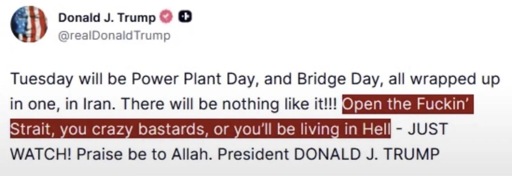 minus-squaretakeda@lemmy.dbzer0.comlinkfedilinkarrow-up62·18 days agoIs this real? I don’t have an account there to verify. Edit: looks like it is https://www.axios.com/2026/04/05/trump-iran-strait-hormuz-bombing-threat