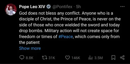 arrow-up1324arrow-down1imagePope bans Trump Administration from Heaven, in retaliation for JD Vance's assassination of former Pontifexlemmy.dbzer0.comsp3ctr4l@lemmy.dbzer0.com to Political Memes@lemmy.worldEnglish · 7 days agomessage-square34linkfedilink