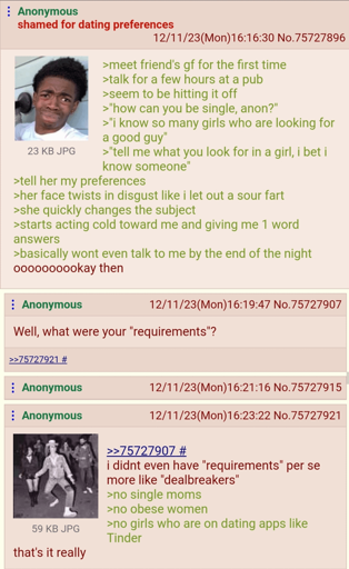 Preferences are fine. It still matters how you express them. In the current zeitgeist, with inceldom being a thing, the way these preferences were expressed smacked of that. The fact that you want to defend this specific trifecta of otherwise completely unrelated preferences, claiming they lead to a better life, makes me think you might be an incel yourself, or maybe just a conservative who’s consumed a few too many such videos promoting “family values” and purporting that these are threatened by a woman’s weight, or her having to raise a child on her own, or her seeking love and attention on dating apps. Truth is these are pretty much unrelated to whether one values family and to each other. It’s just a collection of caricatures, stereotypes, and cautionary tales circulating in conservative circles. If all one can think of when asked for their preferences regarding a partner are these known talking points, it is a little suspect. FWIW, I do not think we should marginalize conservatives. But I do think we should marginalize misogyny.