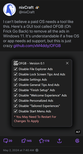 brbposting@sh.itjust.works to linuxmemes@lemmy.world · 2 years agoLook what they need to mimic a fraction of our unshittified experienceplus-squaresh.itjust.worksimagemessage-square0linkfedilinkarrow-up11arrow-down10