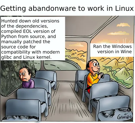 renzev@lemmy.world to linuxmemes@lemmy.worldEnglish · edit-22 years agoWhat do you guys do when you want to run unmaintained programs?plus-squarelemmy.worldimagemessage-square0linkfedilinkarrow-up11arrow-down10